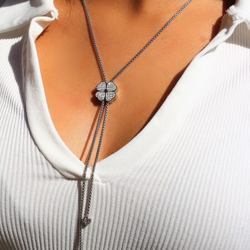 Colar em Aço Inoxidável 2 em 1. É um colar que ao ser fechado visualiza-se como trevo de 4 folhas, mas ao abrir transforma-se em 4 corações. Sendo um lado rosa e quando se abre é branco.
