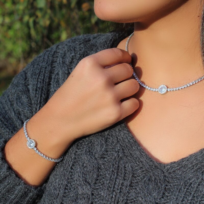 Colar em Aço Inoxidável com zircônias. Medidas: 42 cm de comprimento e extensor ajustável.